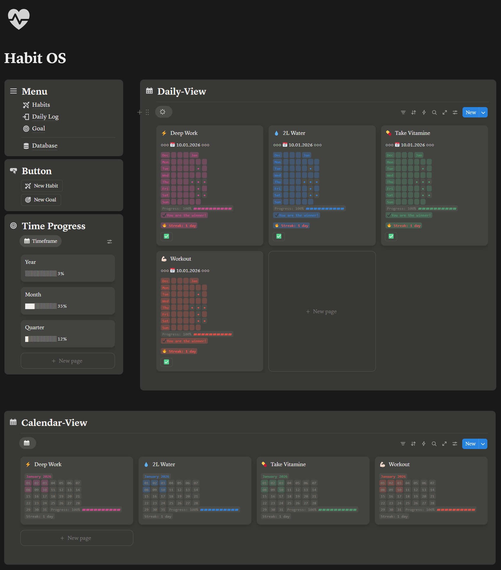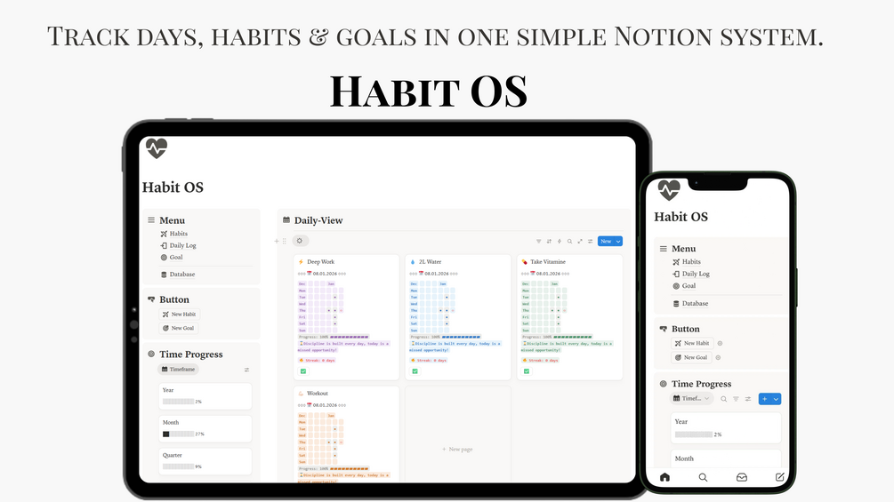 Habit OS is a clean, minimal Notion template that helps you plan your day, track your habits, and hit your goals without wasting time on setup.